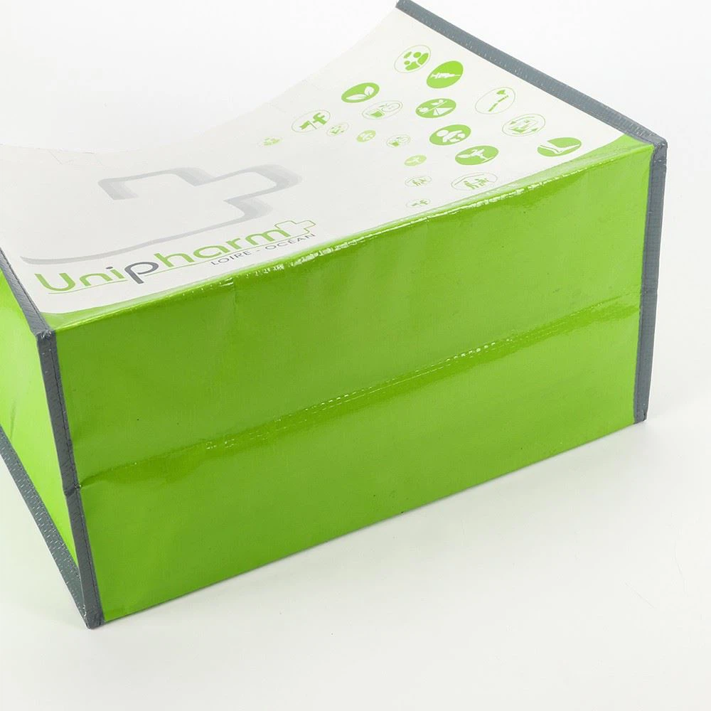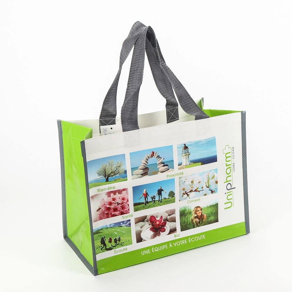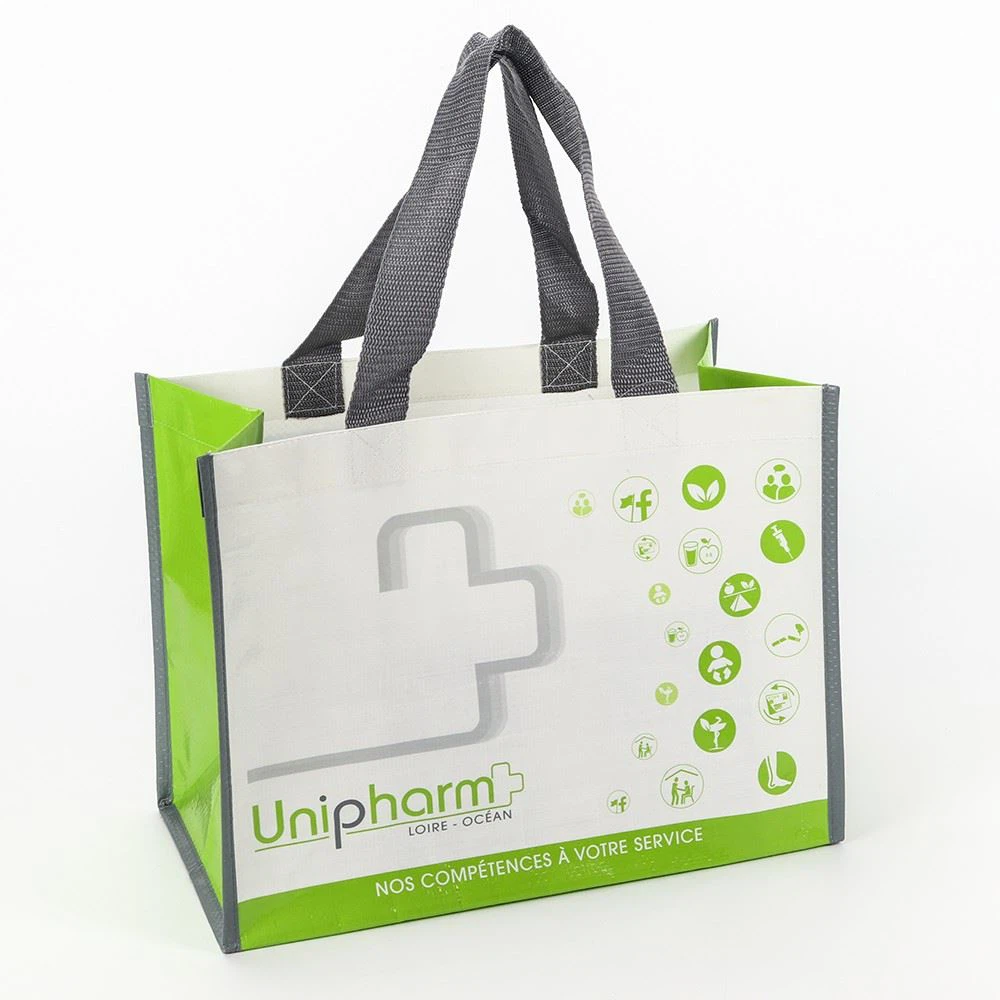 PP Woven bag made with black pp webbing handles. The material is made of 145g PP Woven and with a glossy lamination which gives the bag a brilliant finish. Printing the side gussets is also something we prefer and for this model the result comes out great. We can adjust all details on these PP Woven bags so if you have an interesting idea for your next bags.